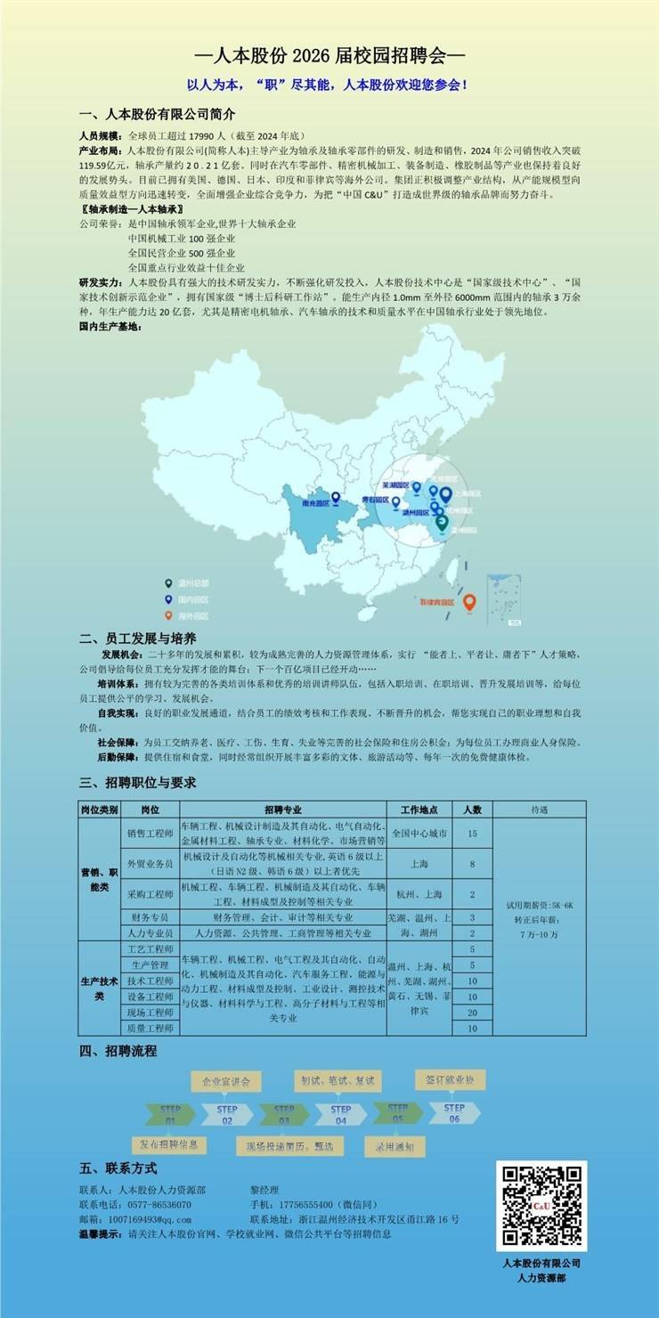 人本股份有限公司(简称人本)主导产业为轴承及轴承零部件的研发、制造和销售,2024年公司销售收入突破119.59亿元,轴承产量约20.21亿套。同时在汽车零部件、精密机械加工、装备制造、橡胶制品等产业也保持着良好的发展势头。目前已拥有美国、德国、日本、印度和菲律宾等海外公司。集团正积极调整产业结构,从产能规模型向质量效益型方向迅速转变,全面增强企业综合竞争力,为把“中国C&U”打造成世界级的轴承品牌而努力奋斗。